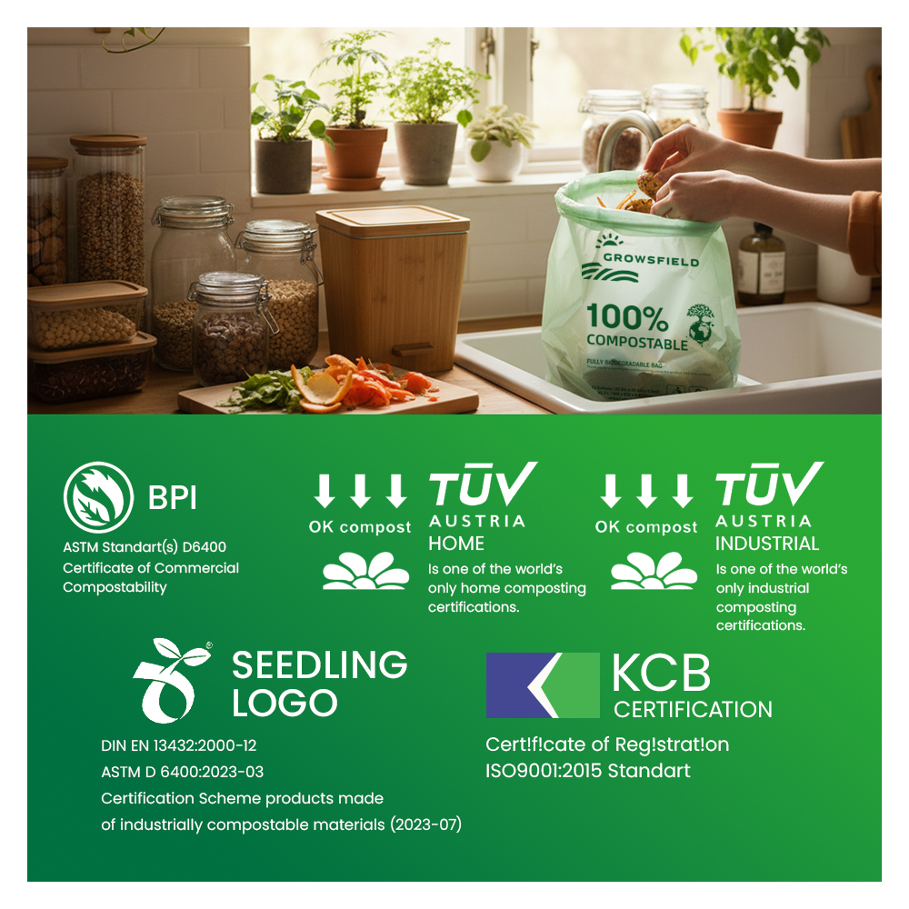 With globally recognized certifications, GROWSFIELD delivers a safe, responsible and high-quality solution to replace traditional plastic bags — trusted by households and professionals alike.